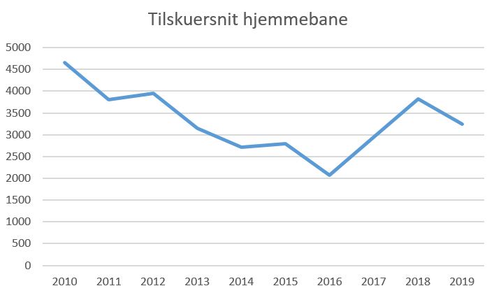 Bemærk at tallene for denne sæson ikke er medregnet da sæsonen stadig er i gang. Her er snit foreløbig på knap 3.400 på hjemmebanen.