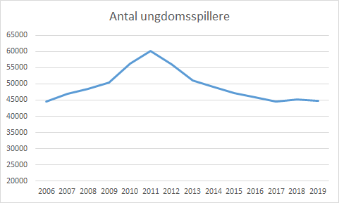Siden 2006 har udviklingen af antal ungdomsspillere set således ud, interessant at der er 15.000 færre piger end i 2010!