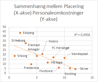 Esbjerg og Silkeborg ligger højt over den stiplede linje, når Viborg så ligger nummer 1, så er pointen at en førsteplads kan nås for væsentlig mindre midler, end det de to klubber bruger.