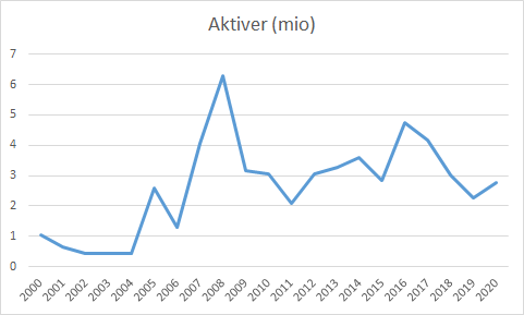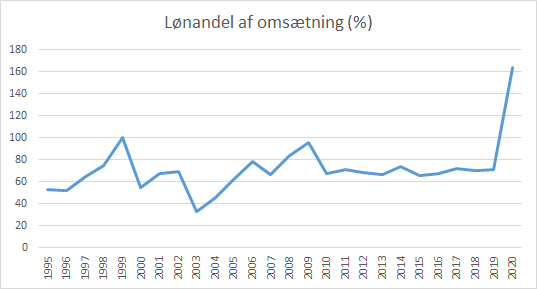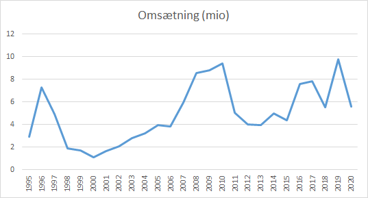 Fra 1998-2002 og 2011-2020 er omsætning ikke oplyst