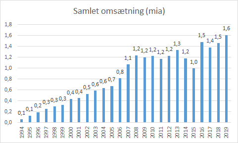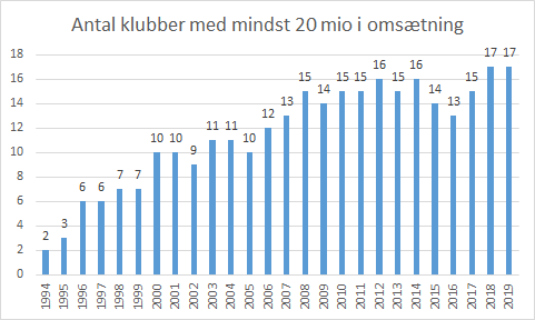 I denne oversigt herunder, ses hvor mange klubber der har netop mindst 20 millioner i omsætning de enkelte år.