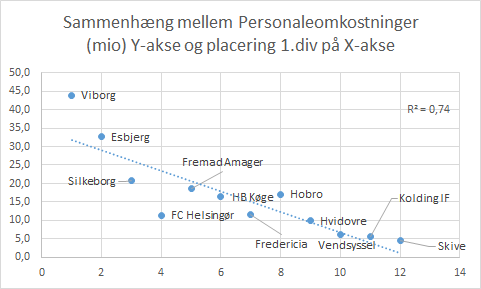 Sammenhængen mellem de to parameter er på 74%, det vil sige at dette tal viser hvor meget personaleomkostninger betyder for en klubs placering.