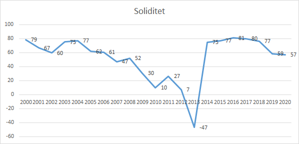 En soliditetgrad på 0 er også sjældent godt, da klubben har finansieret alle sine aktiver med fremmed kapital. Det gør gør klubben meget skrøbelig overfor økonomisk modgang, da der ikke skal meget til, før de ikke kan betale sine økonomiske forpligtelser.