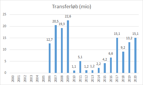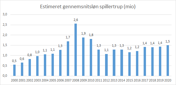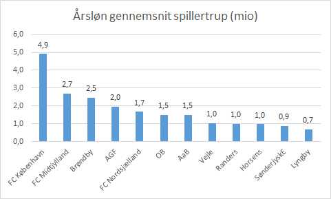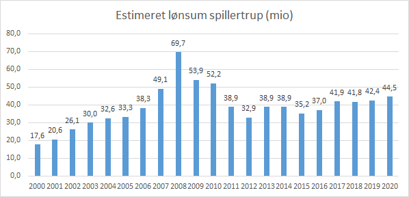 I regnskaberne er der ikke udspecificeret hvor stor selve spillertruppens lønsum er, derfor er det et estimat med afsæt i de oplysninger der er tilgængelige i regnskaberne.