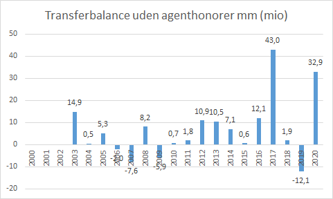 Note: Der er nogle usikkerheder i sammenligningen på tværs af regnskaber, i det nogle regnskaber løber fra sommer til sommer og andre følger kalenderåret. Ligeså er det ikke alle oplysninger der altid er oplyst i det enkelte regnskab, og der er herfor foretaget et estimat.