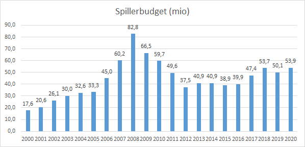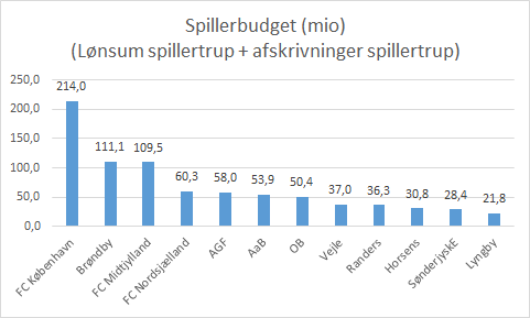 Klubbens spillerbudget er lønsum spillertrup + afskrivninger spillertrup. I regnskabet kendes lønsum for spillertrup ikke, og det er et estimat.