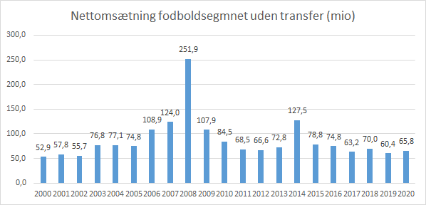 Omsætning er opgjort på to måder, den første er klubbens primære omsætning uden transfer (nettoomsætning), og den anden er hvor transfer er medtaget.