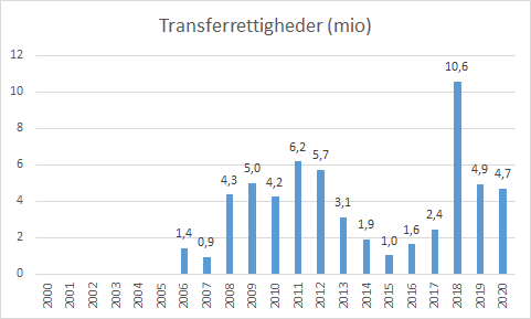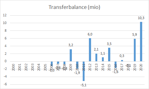 Bliver en spiller købt eller solgt for 18 mio på en treårig kontrakt, så kan det være en aftale hvor betalinger sker i rater, således at de 18 mio ikke optræder i det enkelte regnskab, men 6 mio spredt over 3 regnskaber. Nedenstående er således en oversigt over transferbeløb der kommer ind og ud i det enkelte regnskab.