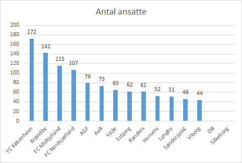 OB og Silkeborg har ikke oplyst antal ansatte i deres fodboldsegment, men det samlede antal ansatte i deres koncern og de står derfor med nul herunder.