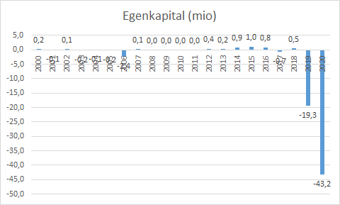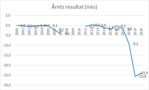 | Rød | Gælden er næsten fordoblet til 50 mio siden seneste regnskab Underskud for 8.regnskab i træk Soliditeten er på -634 Lønandel af omsætning er meget høj (estimeret 181%) Gælden er meget større end aktiverne (734%) Egenkapitalen er på -43 mio (mere end fordoblet negativt) |