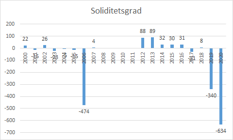 En soliditetgrad på 0 er også sjældent godt, da klubben har finansieret alle sine aktiver med fremmed kapital. Det gør gør klubben meget skrøbelig overfor økonomisk modgang, da der ikke skal meget til, før de ikke kan betale sine økonomiske forpligtelser.