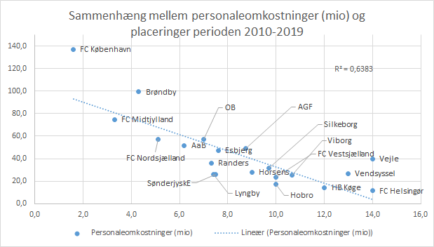 Sammenhængen mellem en klubs samlede personaleomkostninger (alle ansatte) og placeringen i Superligaen for perioden 2010-19 ser således ud.