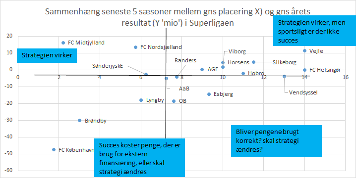 Men med afsæt i de seneste fem sæsoner i Superligaen, hvordan har klubberne klaret sig sportsligt og økonomisk, det giver en model, hvor klubberne så kan placeres ind i!