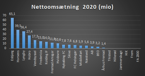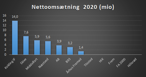 Dette dækker over klubbens omsætning uden indtægter fra andre segmenter og transfer. Kolding og Skive er nedrykkere og vil forventeligt gå ned i omsætning, da TV pengene i 2.division er markant mindre end i 1.division.