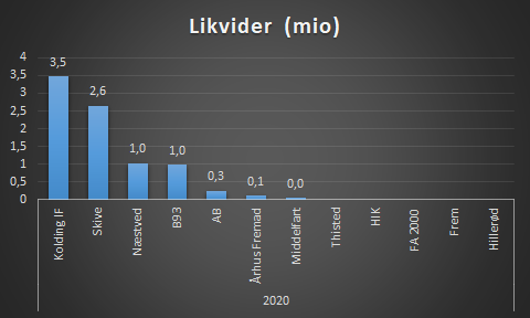 Hvordan ser det ud i forhold til klubbernes likvide beholdninger, nedenstående er det beløb klubberne havde da de afsluttede deres regnskab, og det betyder ikke at det er den sum penge der står på kontoen dags dato.