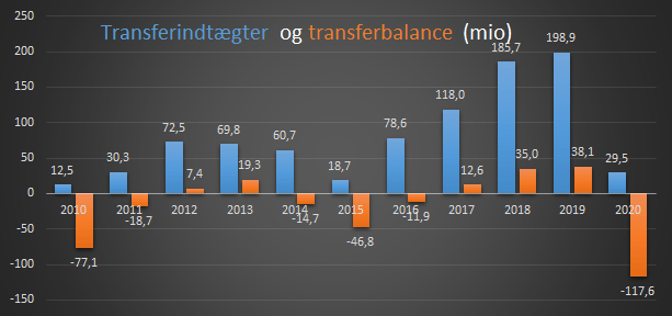 Grafen herunder viser klubbens transferindtægter og transferbalance.