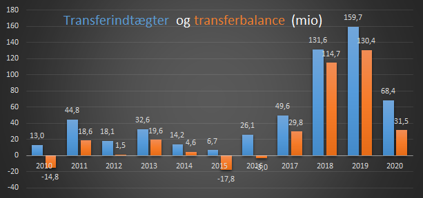 Grafen herunder viser klubbens transferindtægter og transferbalance.