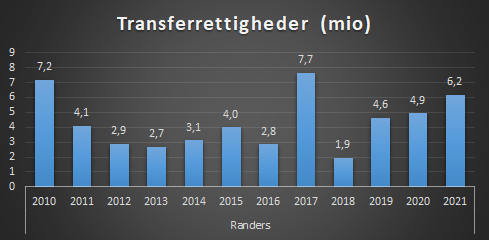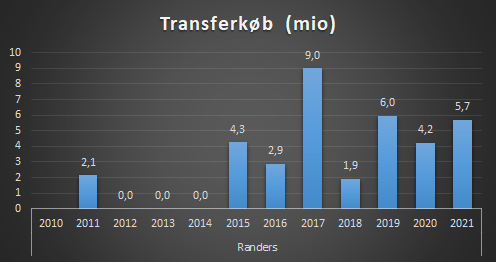 | Spillersalg | Randersoplyser ikke hvad resultatet af deres transferaktivitet er i regnskabet. Spillersalg er dog typisk opgjort over flere regnskaber. Sælges en spiller for 40 mio på en 4 årig kontrakt, kan der være indtægt på 10 mio næste 4 regnskaber. |