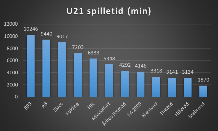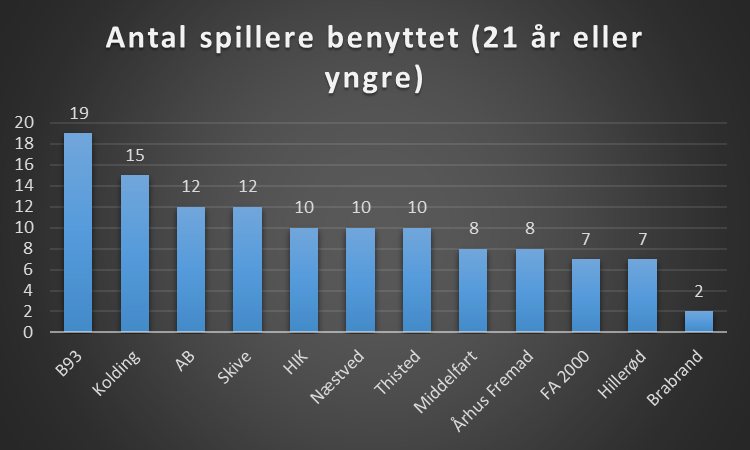 Det er B 93 der topper listen med flest spilleminutter til de unge spillere, med AB og Skive ikke langt efter.
