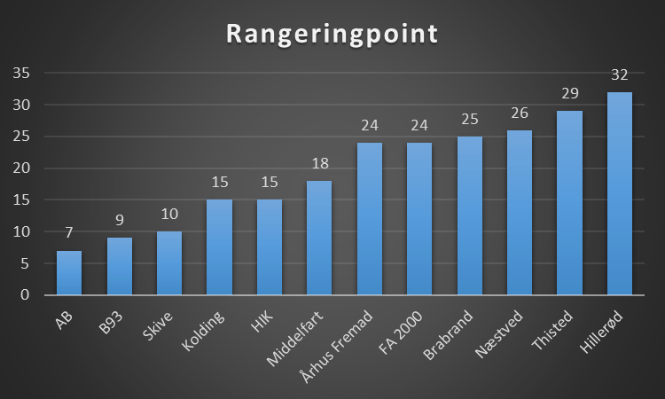 Hvis de 12 klubber rangeres fra 1-12 på de tre ovenstående, og der gives på som klubberne er rangeret, så giver det nedenstående.