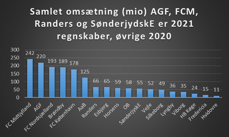I nedenstående er AGF, FC Midtjylland, Randers FC og SønderjyskE eneste klubber med regnskab for 2021, mens resten er for 2020. Det skal noteres at Silkeborg og Viborgs seneste regnskab er fra da de lå i 1.division, og dermed have mindre indtægter og udgifter.