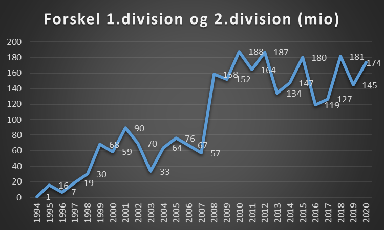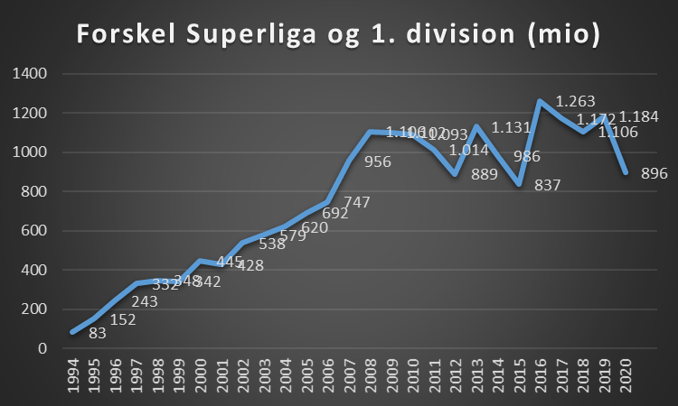 Hvis der ses på udviklingen i forskellen på omsætningen mellem Superliga og 1. division, så ser den således ud.