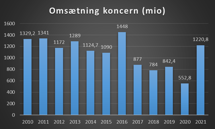 Omsætningen herunder viser for hele koncernen og for selve fodboldsegmentet. En væsentlig årsag til nedgang i omsætning skyldes frasalg af fitnesssegment.