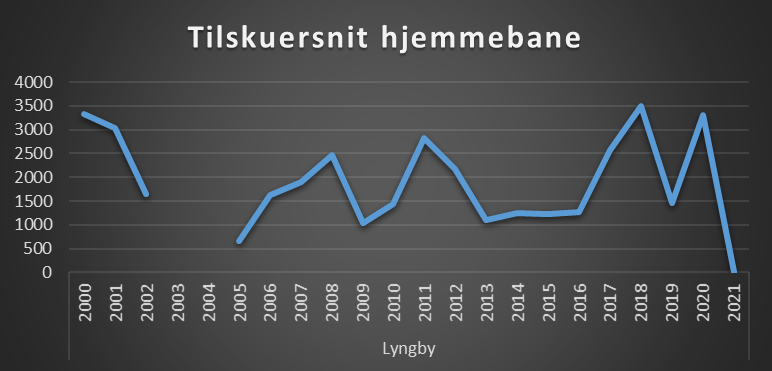 Tallet for 2021 er ikke medtaget grundet corona og står som 0. Ligeså er der ikke data på 2003-2004, hvor klubben var i Danmarksserien og 2.div