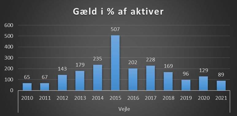 | Gul | Gælden er lidt bekymrende i forhold til aktiver (89%), har dog været meget højere |