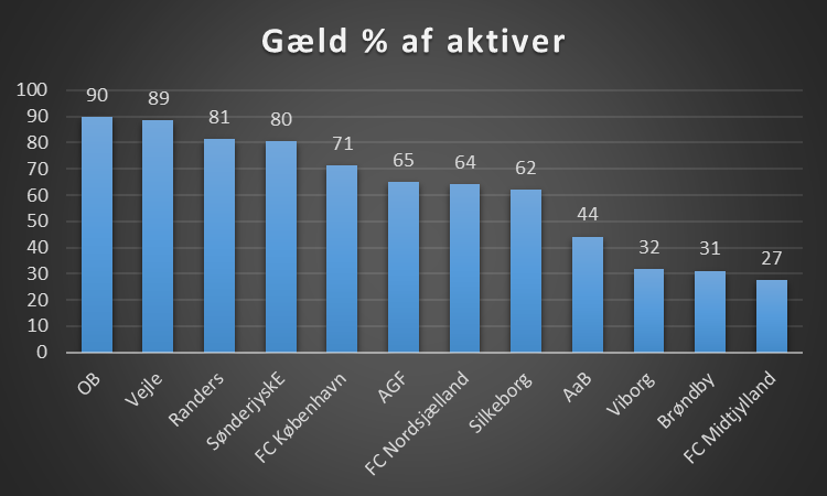 FC Købehavn har den største gæld, men det som er interessant at se på, er i forhold til klubbens aktiver (værdier). Hvis gælden overstiger aktiverne kan det være en udfordring.