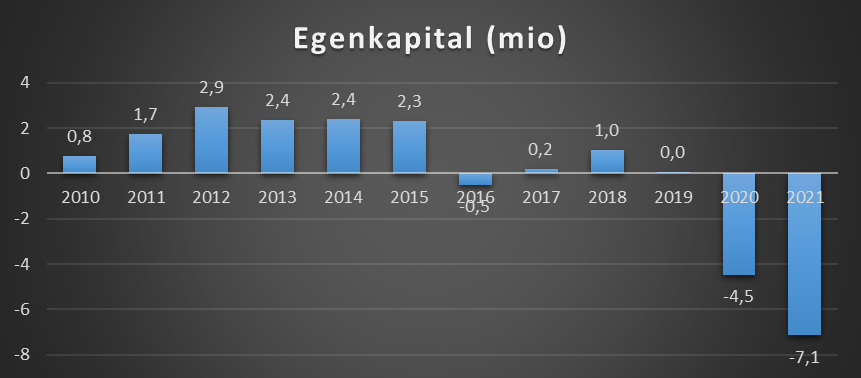 | Rød | Soliditet er på -96 Gælden overstiger aktiverne (196%) Negativ egenkapital på -7,1 mio |