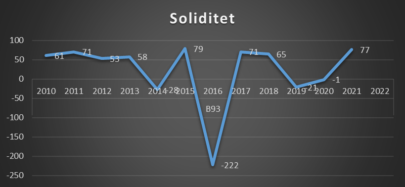 | Grøn | Soliditet på 77 Aktiver for 5,5 mio (2020=1,5 mio) Gælden udgør 11% af aktiverne Gæld næsten halveret fra 1,1 mio til 650.000 Egenkapital på 4,2 mio (2021 = -18.000) |