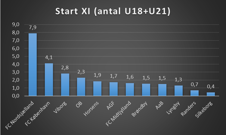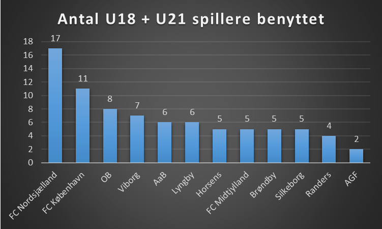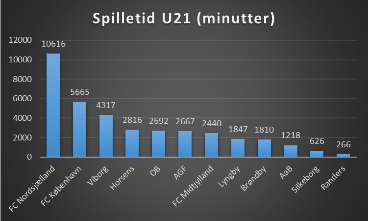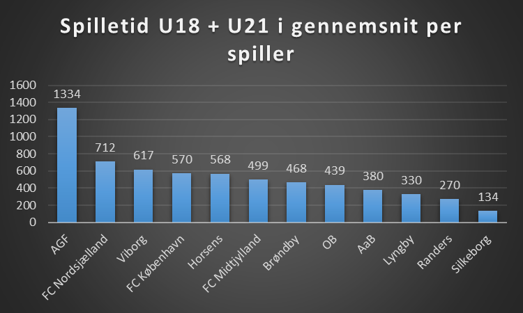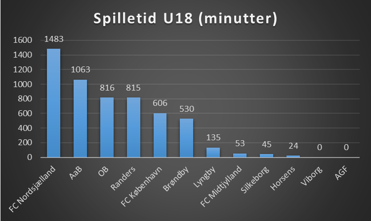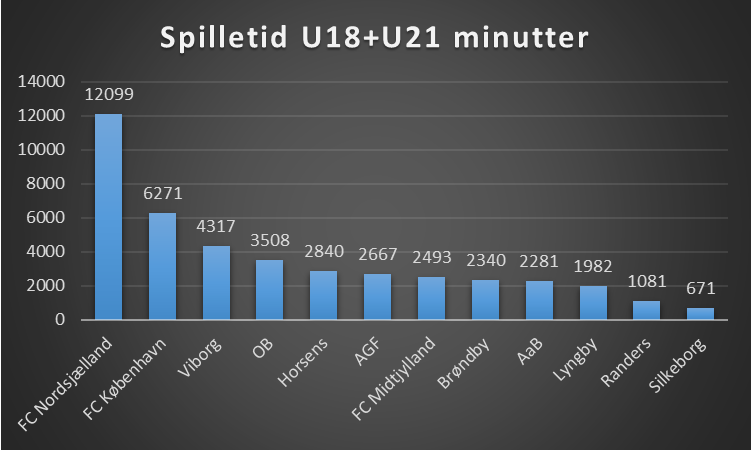 Ikke overraskende er det FC Nordsjælland der topper, og interessant at AaB ligger nummer to på spilletid til U18 spillere men ligger i bunden for U21 spillere.