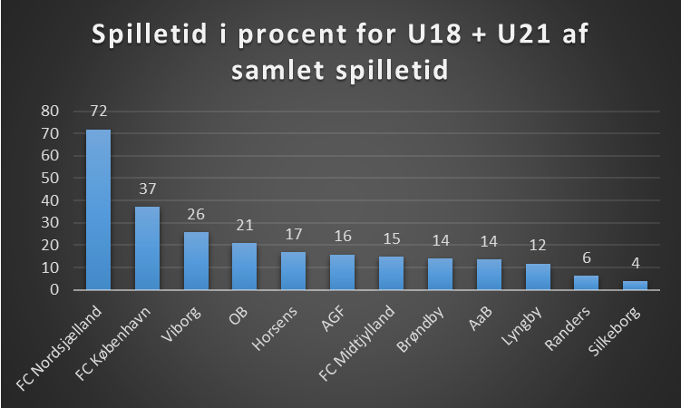 Imponerende at 72% af al spilletid går til de unge i FC Nordsjælland, og interessant at FC København faktisk ligger så højt!