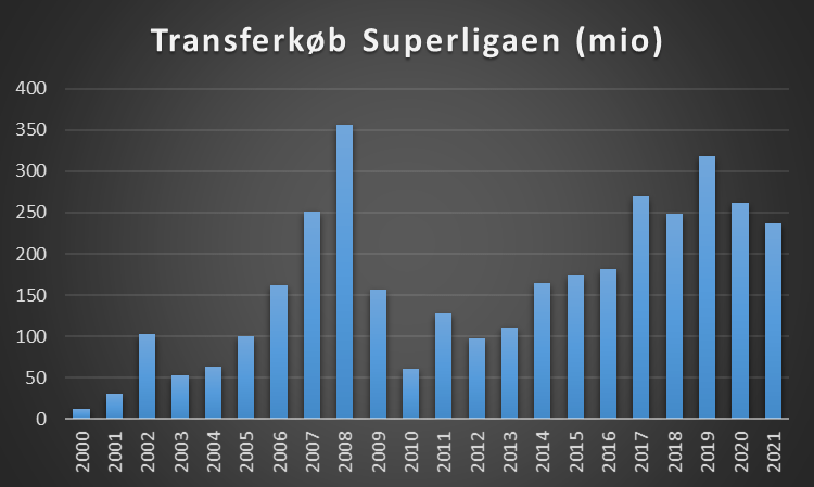 Oversigten herunder, viser hvor meget de danske klubber der har været i Superligaen har købt spillere for i den enkelte sæson.