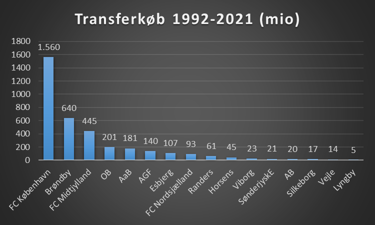 Oversigten herunder, viser hvor meget de danske klubber der har været i Superligaen har købt spillere for i den enkelte sæson.