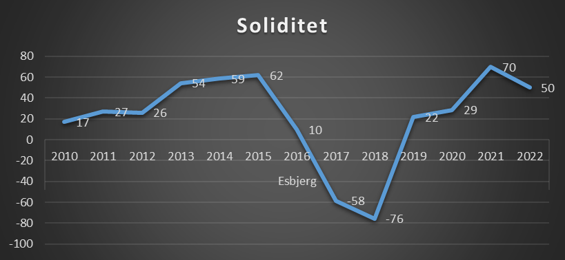 En soliditetsgrad på 0 er også sjældent godt, da klubben har finansieret alle sine aktiver med fremmed kapital. Det gør gør klubben meget skrøbelig overfor økonomisk modgang, da der ikke skal meget til, før de ikke kan betale sine økonomiske forpligtelser.