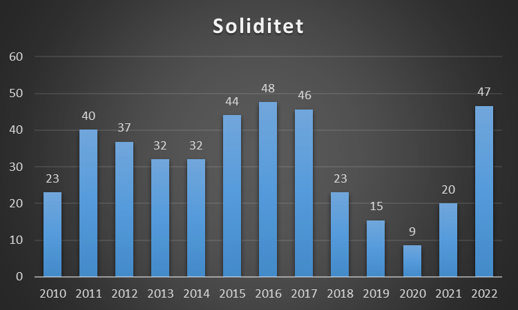 En soliditetsgrad på 0 er også sjældent godt, da klubben har finansieret alle sine aktiver med fremmed kapital. Det gør gør klubben meget skrøbelig overfor økonomisk modgang, da der ikke skal meget til, før de ikke kan betale sine økonomiske forpligtelser.