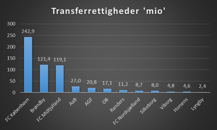 Ses der på hvor mange penge selve truppen er værd (transferettigheder) og hvor mange midler der er brugt på spillerkøb, ser det således ud.