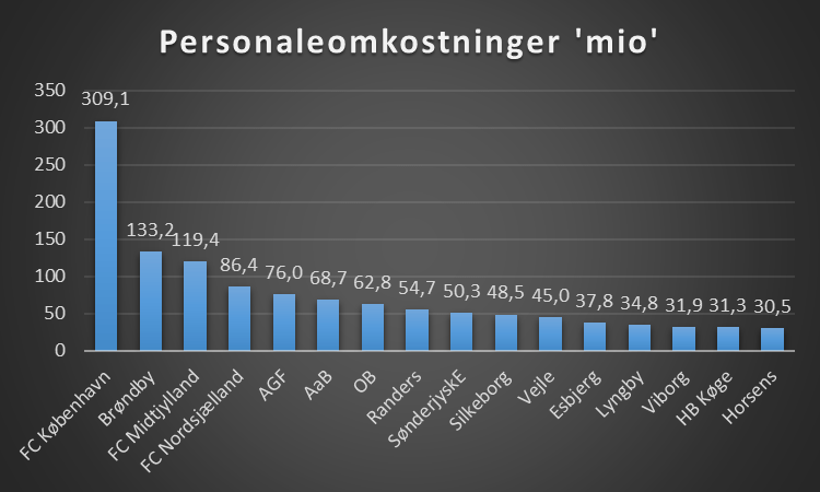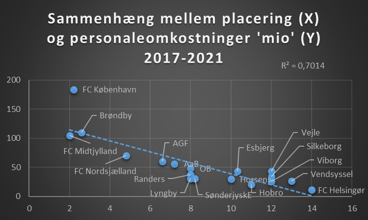 Ses der på sammenhæng mellem placering og personaleomkostninger, så er sammenhængen 70% når der ses på de seneste fem sæsoner i Superligaen 2017-2021, og skal en klub forvente ikke at rykke ned, så er markør sagt på 40 mio i personaleomkostninger.