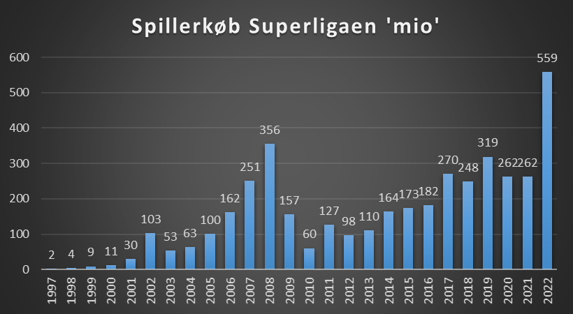 Den historiske udvikling for superligaen for spillerindkøb ser således ud