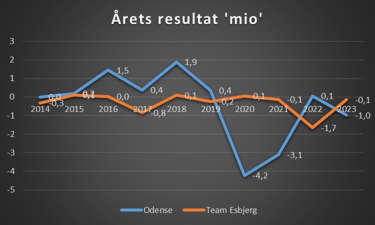Over de ti regnskaber har begge klubber tabt penge samlet set, med 3 mio til Esbjerg og knap 4 mio til Odense!