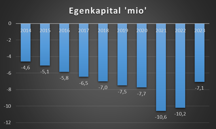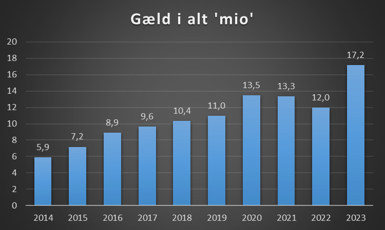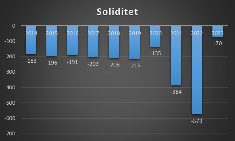 | Rød | Soliditet er på -70 Gælden er på 170% af aktiver Gælden er steget til 17,1 mio fra 11,9 mio Egenkapital er -7 mio |