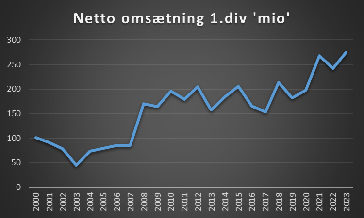 Den samlede udvikling giver et billede, men det afhænger også af hvor mange hold har været i 1.division de enkelte år, så herunder den gennemsnitlige omsætning per klub siden år 2000.