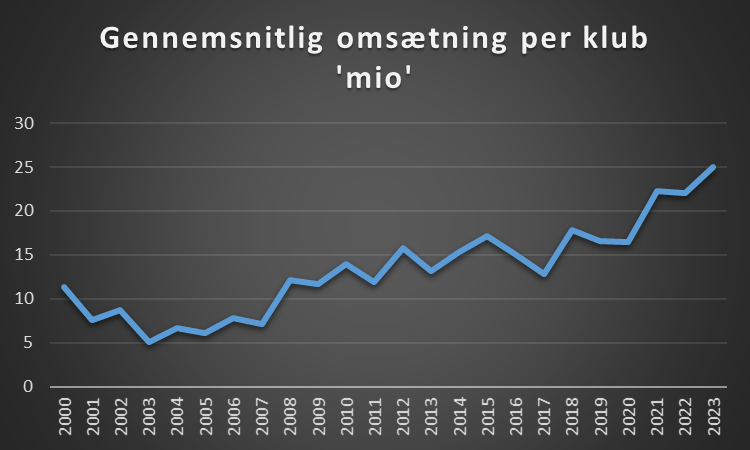 Den samlede omsætning for klubberne er vist herunder, siden 2019 er der sket en markant udvikling,