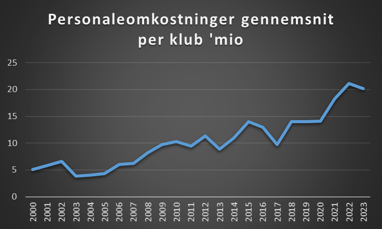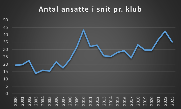 Her er det interessant at bemærke at i de sidste 10 år, er en klub gået fra 25 ansatte til 35. et betyder at der er kommet 10 flere ansatte pr. klub. Det er næppe spillere alle sammen, så klubberne er blevet opgraderet i deres setup rundet om holdet