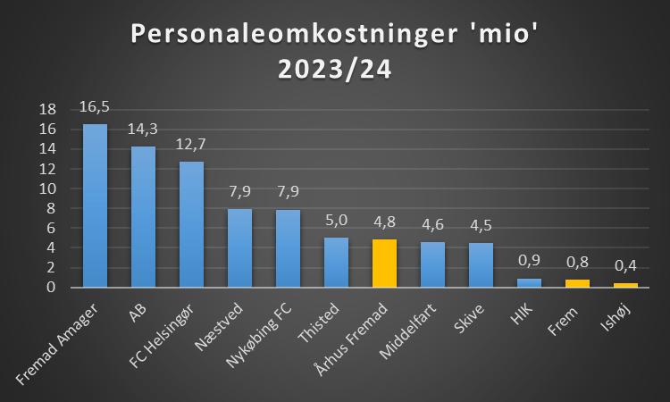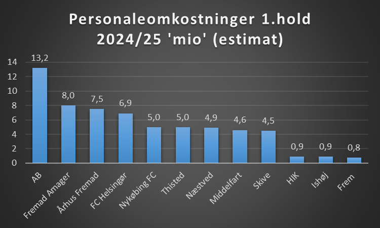 Ses der på klubbernes personaleomkostninger fra seneste regnskab, giver det en ide om hvor klubberne ligger henne rent økonomisk, og der hvor søjlen er gul, skyldes det at tallet ikke er oplyst i et offentligt tilgængeligt regnskab, og er et estimat.