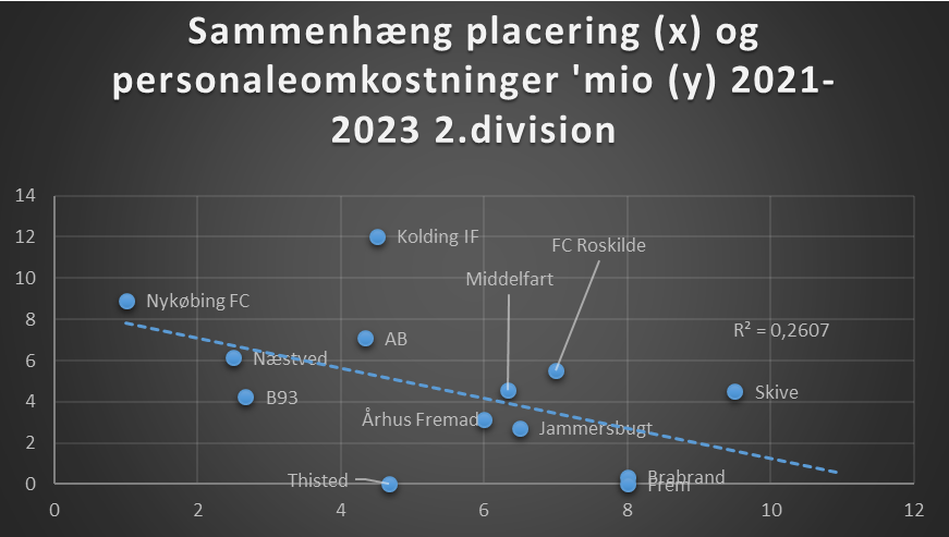 Den blå tendenslinje viser sammenhængen. Ligger en klub over, så præsterer den dårligere end hvad økonomien tilsiger, og omvendt ligger en klub under, så klarer den sig bedre end hvad økonomien tilsiger.