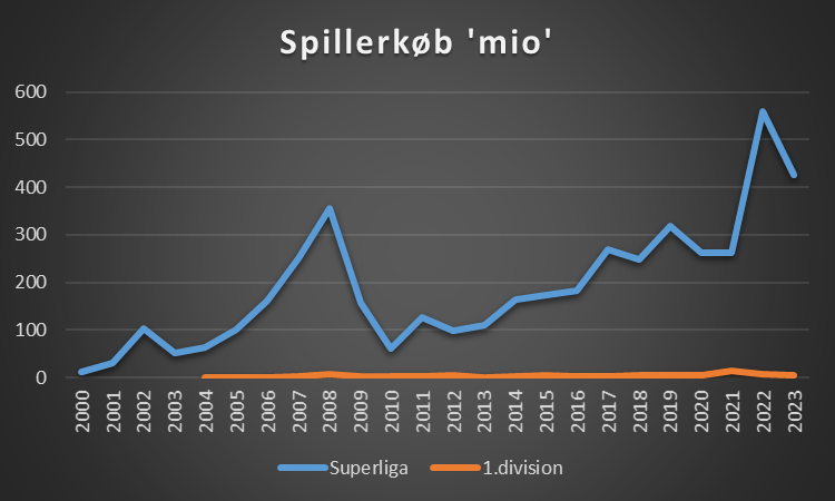 Ses der på hvor meget klubberne i Superligaen og 1.division har købt for, så har udviklingen været således siden år 2000.