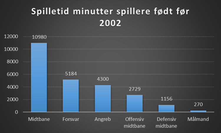 Her viser det klart at klubberne giver mest spilletid til spillerne på midtbanen. Det skal også med at en klubs taktiske formation spiller ind. Hvis en klub har en angriber, så er det det ikke let at få spilletid, og omvendt spiller en klub med en midtbane med fem spillere, vil det give bedre muligheder!